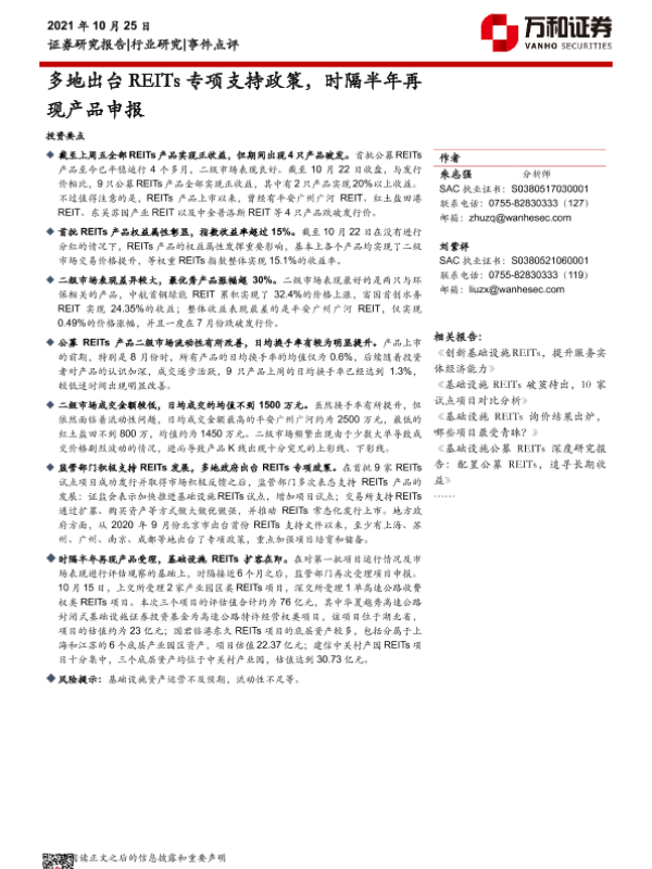 【万和证券】【20211025】多地出台REITs专项支持政策,时隔半年再现产品申报-8页 行业研究