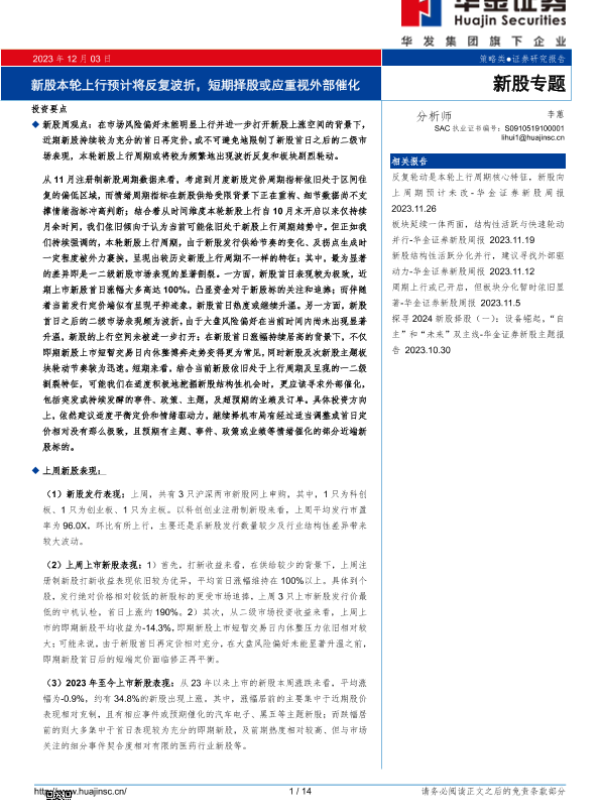 【华金证券】【20231203】新股专题:新股本轮上行预计将反复波折,短期择股或应重视外部催化-14页 行业研究