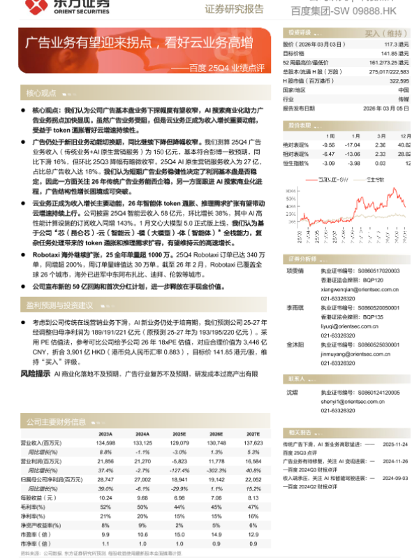 【东方证券】【202603】百度25Q4业绩点评——广告业务有望迎来拐点,看好云业务高增-5页 证券期货研究报告