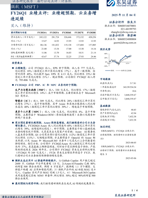 【东吴证券】【202511】微软(MSFT):FY26Q1业绩点评:业绩超预期,云业务增速延续-4页 证券期货研究报告
