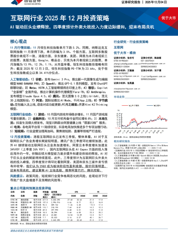 【国信证券】【202512】互联网行业2025年12月投资策略_AI驱动巨头业绩释放_四季度预计外卖大战投入力度边际缓和_迎来布局良机-18页 证券期货研究报告