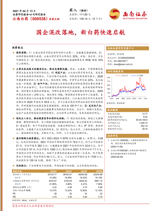 【西南证券】【20210413】云南白药:国企混改落地,新白药快速启航-35页 行业研究