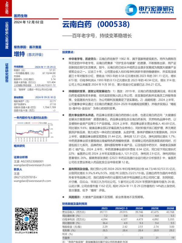 【申万宏源】【20241202】云南白药(000538)百年老字号,持续变革稳增长-26页 行业研究