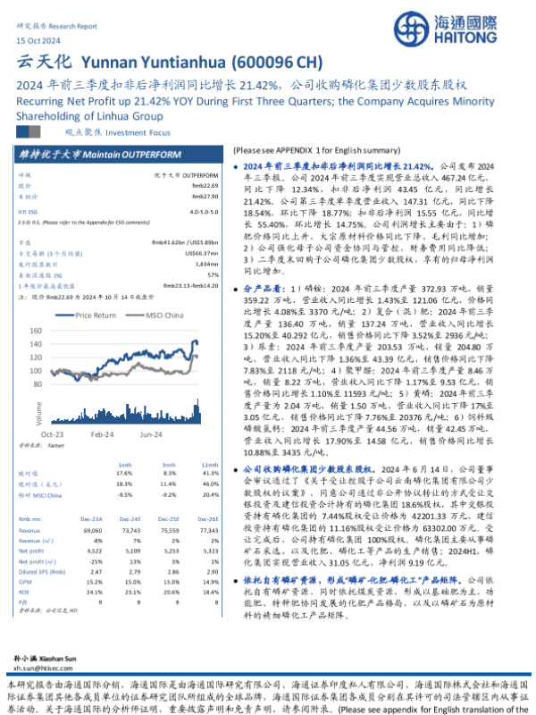 【海通国际】【20241015】云天化(600096)2024年前三季度扣非后净利润同比增长21.42%,公司收购磷化集团少数股东股权-13页 行业研究