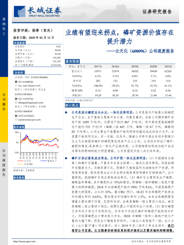 【长城证券】【20200212】20200212-长城证券-云天化-600096.SH-公司深度报告:业绩有望迎来拐点,磷矿资源价值存在提升潜力-41页 行业研究