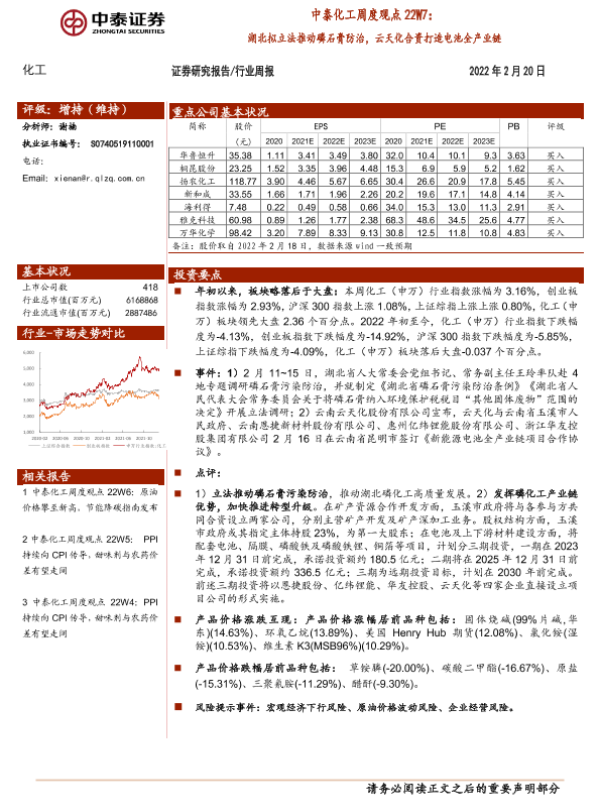 【中泰证券】【20220220】中泰化工周度观点22W7:湖北拟立法推动磷石膏防治,云天化合资打造电池全产业链-23页 行业研究