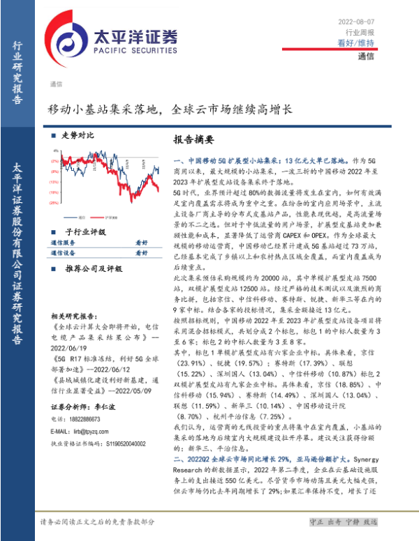 【太平洋证券】【20220807】20220807-太平洋-通信行业周报:移动小基站集采落地,全球云市场继续高增长-23页 行业研究