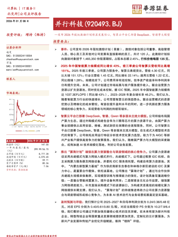 【华源证券】【202601】发布2026年股权激励计划彰显发展信心,智算云平台已部署DeepSeek、智谱等大模型-4页 证券期货研究报告