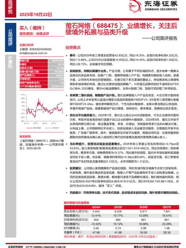 【东海证券】【202510】萤石网络(688475):业绩增长,关注后续境外拓展与品类升级-6页 证券期货研究报告