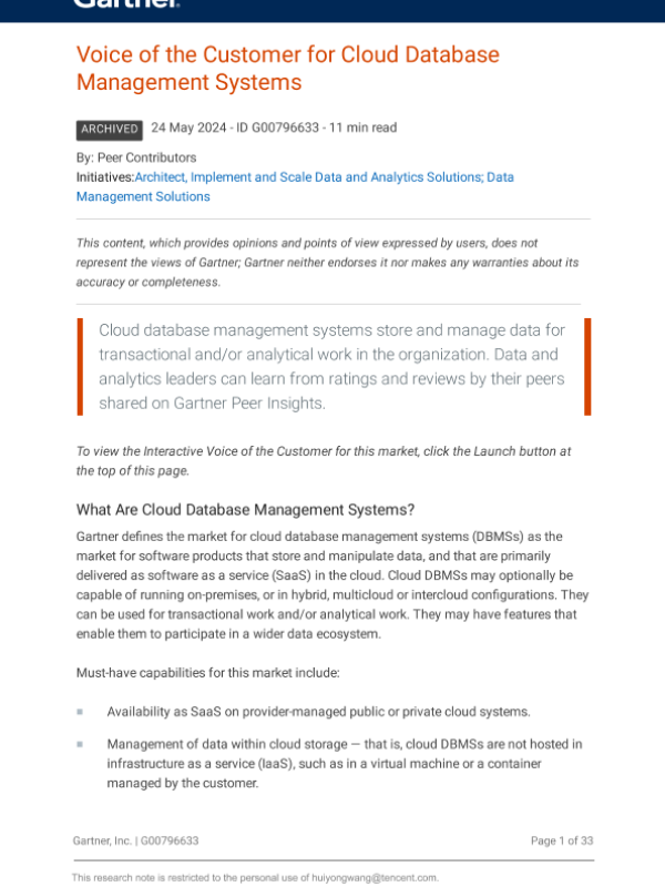 【Gartner&Inc.】【202405】Voice of the Customer for Cloud Database Management Systems-33页 市场调研