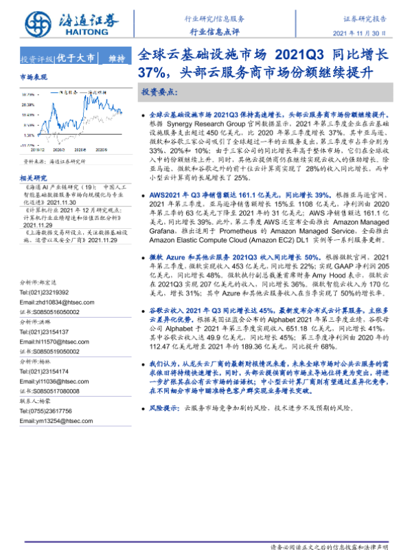 【海通证券】【20211130】全球云基础设施市场2021Q3同比增长37%,头部云服务商市场份额继续提升-2页 行业研究
