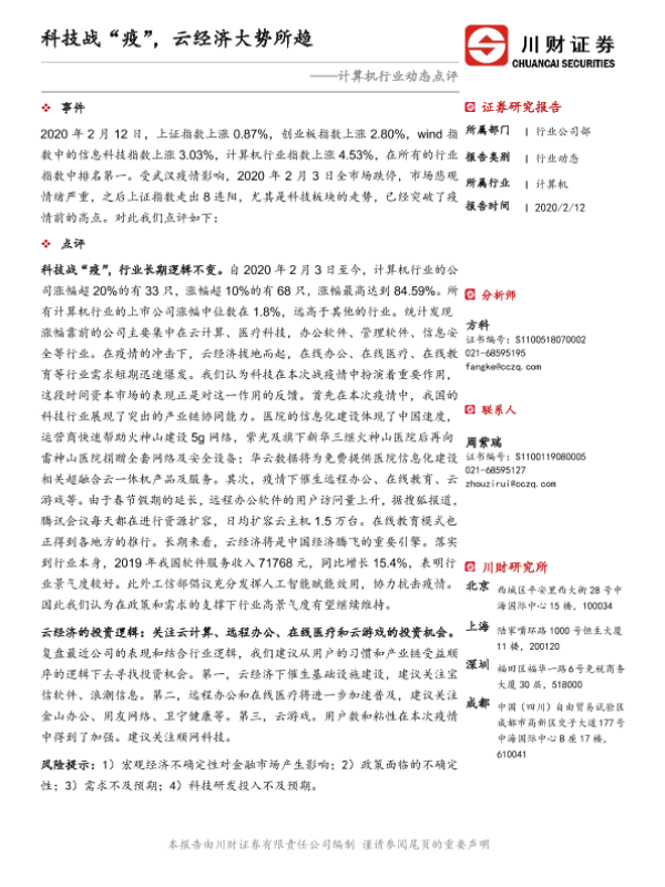 【川财证券】【20200212】计算机行业动态点评:科技战“疫”,云经济大势所趋-2页 证券期货研究报告