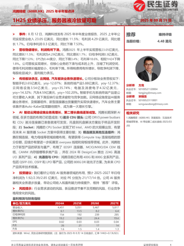 【民生证券】【20250815】2025年半年报点评_1H25业绩承压_服务器液冷放量可期-3页 财报
