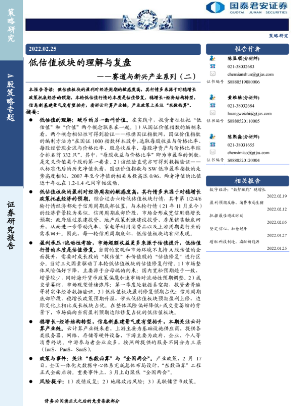 【国泰君安证券】【20220225】赛道与新兴产业系列(二):低估值板块的理解与复盘-16页 行业研究