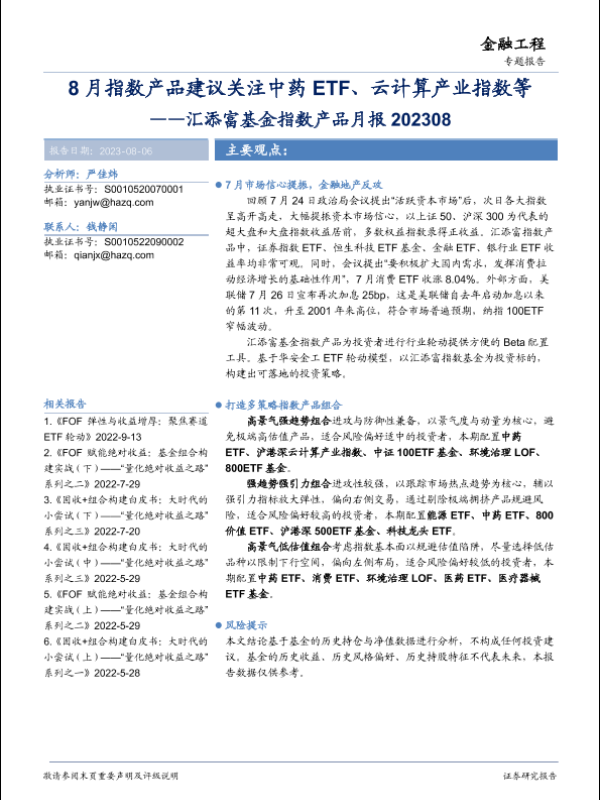 【华安证券】【20230806】汇添富基金指数产品月报:8月指数产品建议关注中药ETF、云计算产业指数等-18页 行业研究