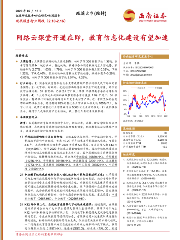 【西南证券】【20200216】现代服务行业周报:网络云课堂开通在即,教育信息化建设有望加速-12页 行业研究
