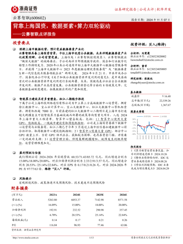 【浙商证券】【20241107】云赛智联(600602)点评报告:背靠上海国资,数据要素+算力双轮驱动-13页 行业研究