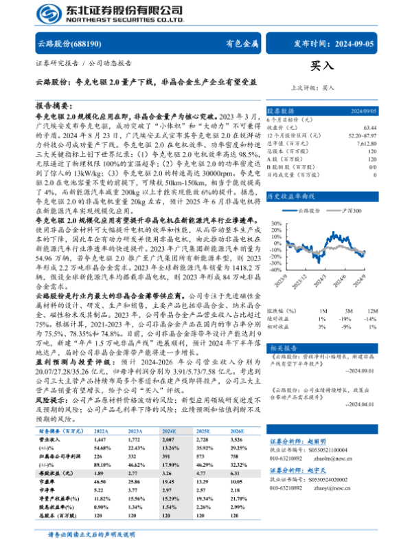【东北证券】【20240905】云路股份:夸克电驱 2.0量产下线,非晶合金生产企业有望受益-11页 行业研究