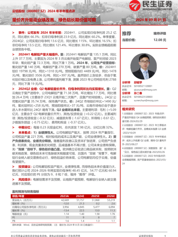 【民生证券】【20240901】云铝股份(000807)2024年半年报点评:量价齐升驱动业绩改善,绿色铝长期价值可期-15页 行业研究