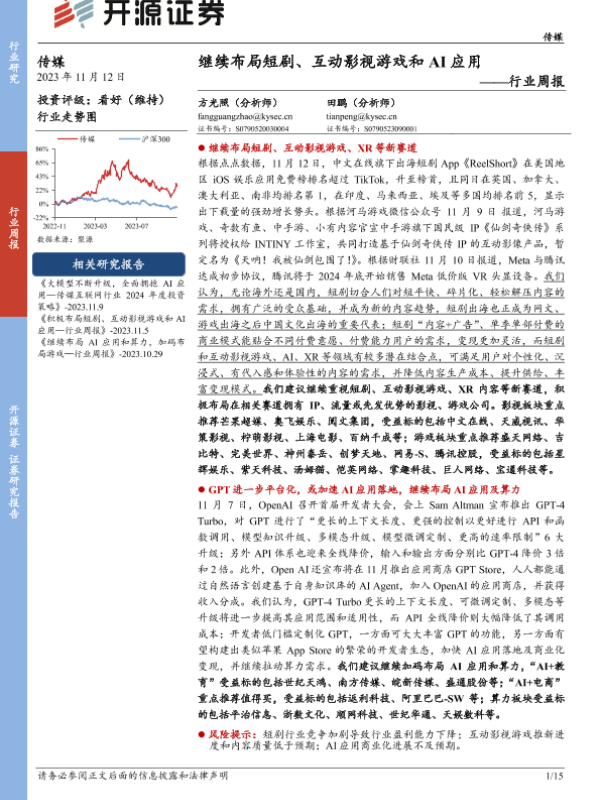 【开源证券】【20231112】传媒行业周报:继续布局短剧、互动影视游戏和AI应用-14页 行业研究