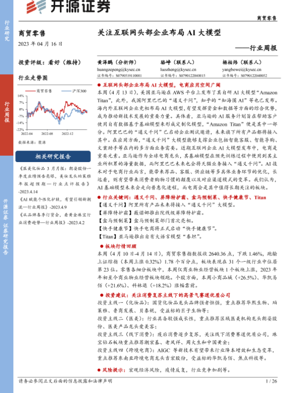 【开源证券】【20230416】商贸零售行业周报:关注互联网头部企业布局AI大模型-26页 行业研究