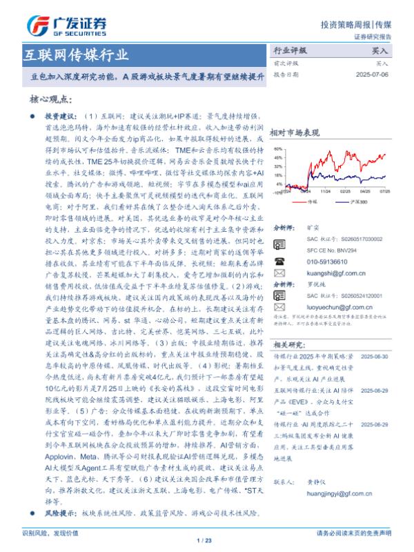 【广发证券】【20250706】豆包加入深度研究功能,A股游戏板块景气度暑期有望继续提升-23页 证券期货研究报告