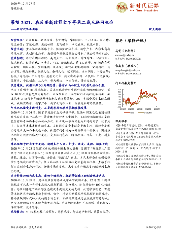 【新时代证券】【20201227】新时代传媒周报:展望2021,在反垄断政策之下寻找二线互联网机会-34页 行业研究