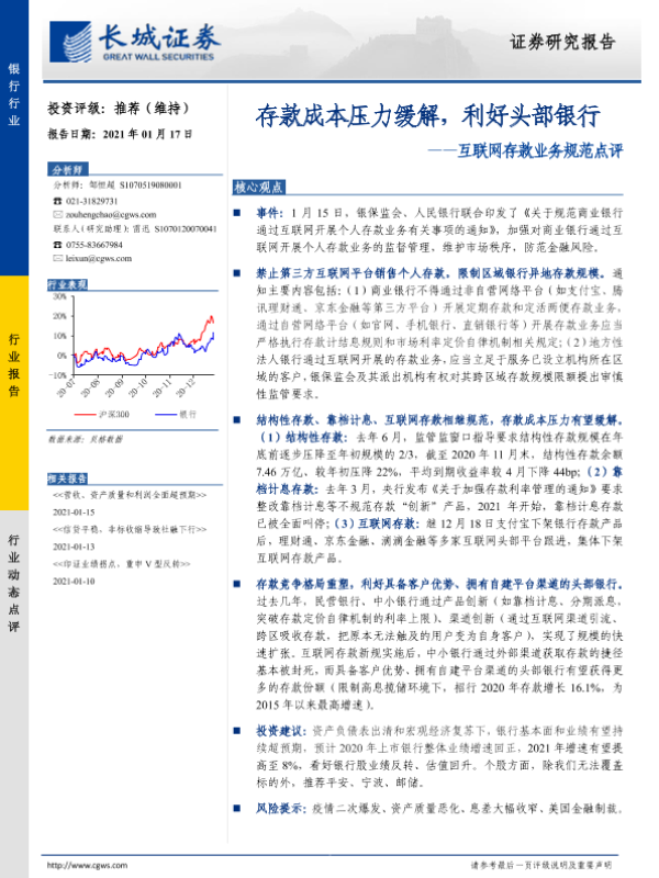 【长城证券】【20210117】互联网存款业务规范点评:存款成本压力缓解,利好头部银行-2页 行业研究