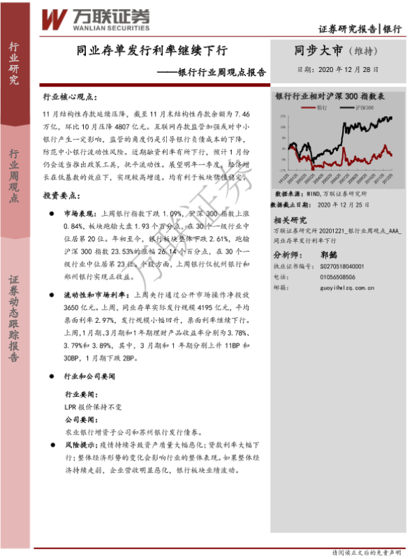 【万联证券】【20201228】银行行业周观点报告:同业存单发行利率继续下行-7页 行业研究