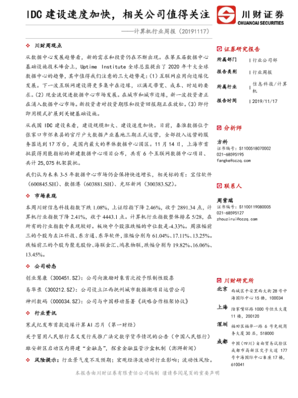 【川财证券】【20191117】计算机行业周报:IDC建设速度加快,相关公司值得关注-11页 行业研究