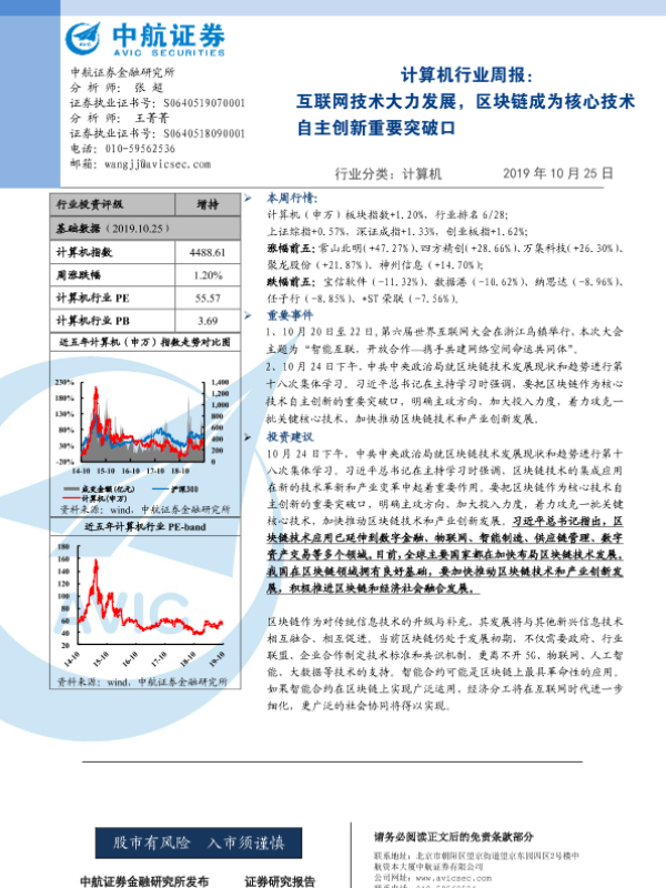 【中航证券】【20191025】计算机行业周报:互联网技术大力发展,区块链成为核心技术自主创新重要突破口-4页 行业研究