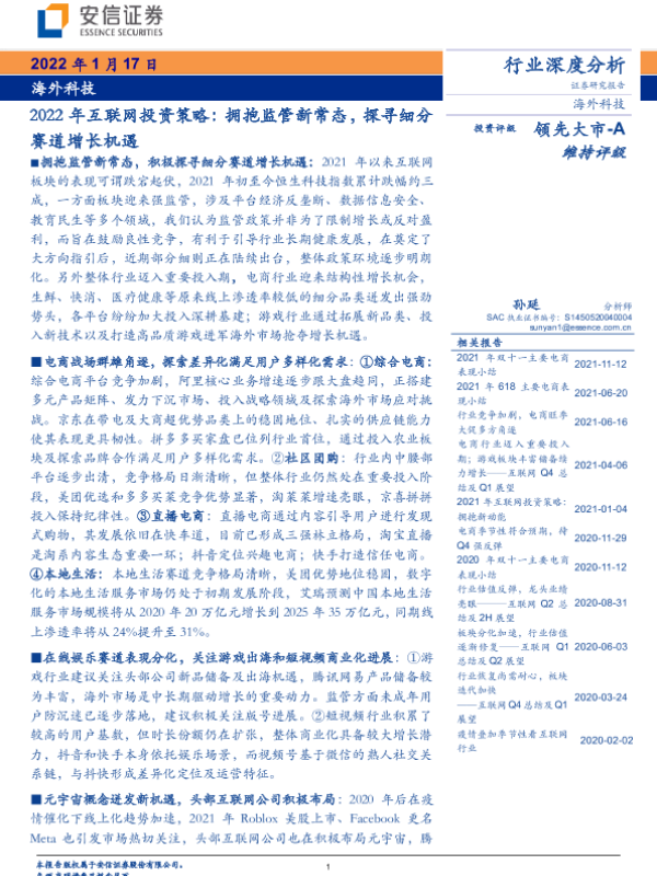 【安信证券】【20220117】海外科技行业2022年互联网投资策略:拥抱监管新常态,探寻细分赛道增长机遇-45页 行业研究