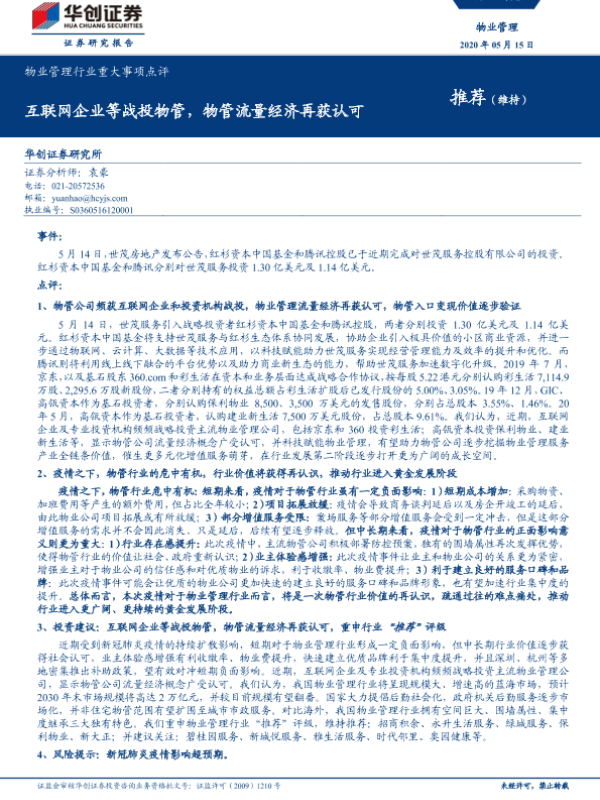 【华创证券】【20200515】物业管理行业重大事项点评:互联网企业等战投物管,物管流量经济再获认可-5页 行业研究