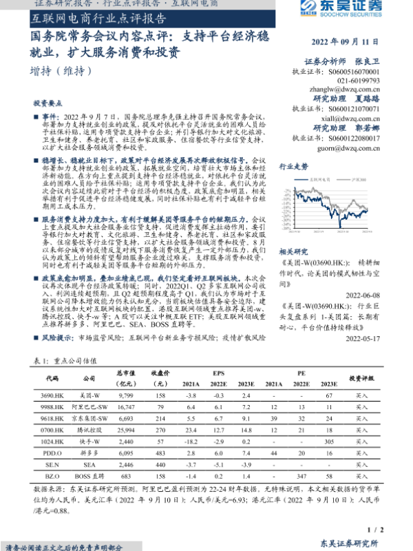 【东吴证券】【20220911】互联网电商行业点评报告:支持平台经济稳就业,扩大服务消费和投资-2页 行业研究