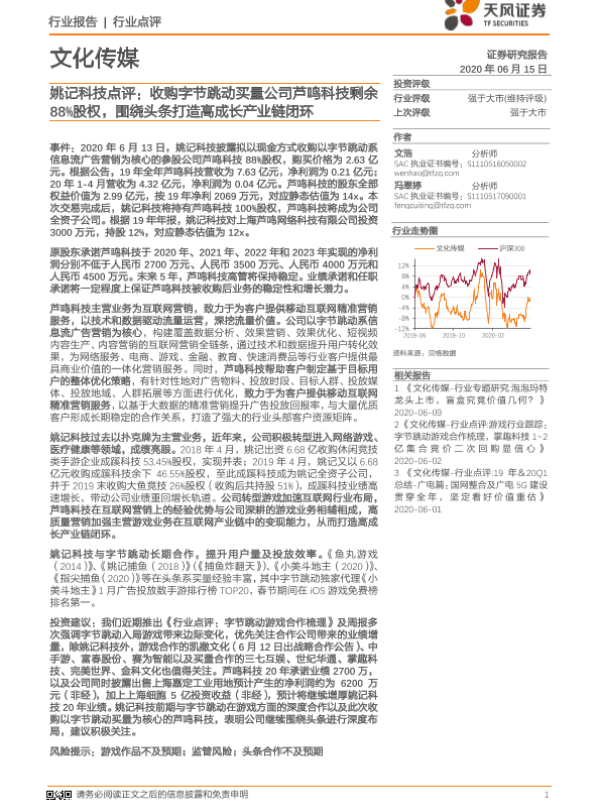 【天风证券】【20200615】姚记科技点评:收购字节跳动买量公司芦鸣科技剩余88%股权,围绕头条打造高成长产业链闭环-5页 行业研究
