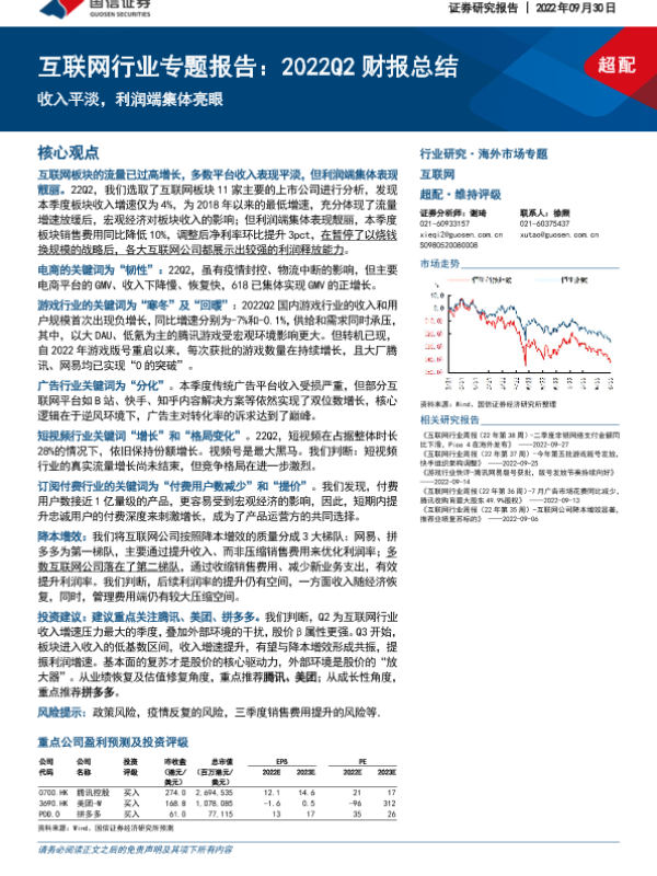 【国信证券】【20220930】互联网行业专题报告:2022Q2财报总结:收入平淡,利润端集体亮眼-34页 行业研究
