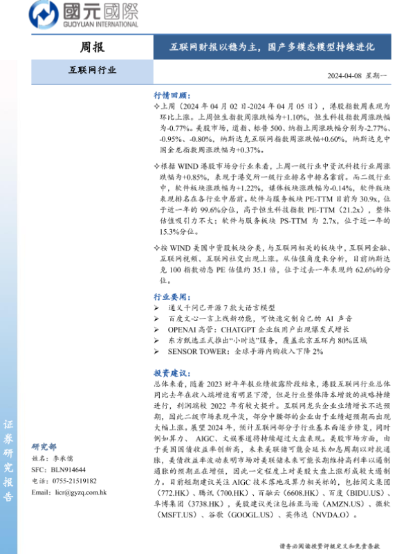 【国元国际】【20240408】互联网行业:互联网财报以稳为主,国产多模态模型持续进化-11页 行业研究