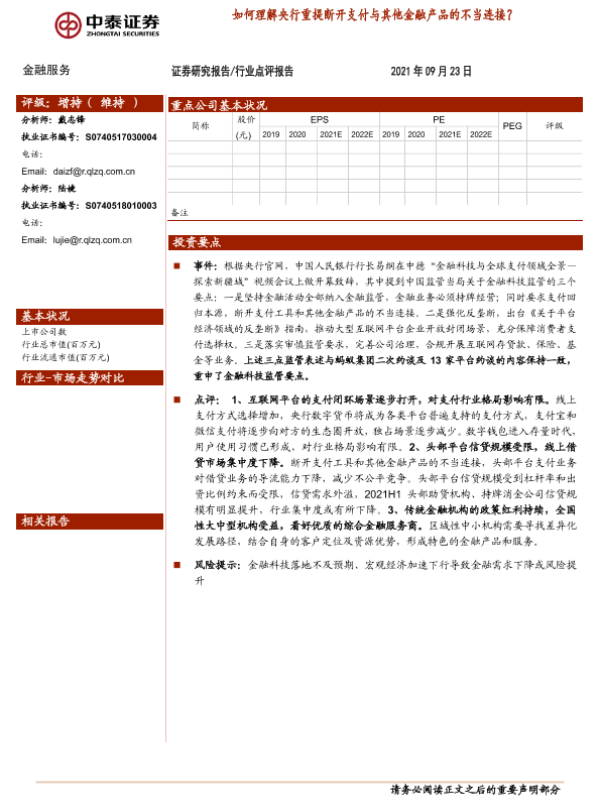【中泰证券】【20210923】如何理解央行重提断开支付与其他金融产品的不当连接-7页 行业研究