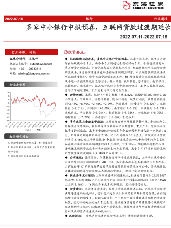 【东海证券】【20220718】银行行业周报:多家中小银行中报预喜,互联网贷款过渡期延长-12页 行业研究