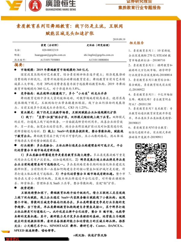 【广证恒生】【20190919】素质教育系列Ⅶ舞蹈教育:线下仍是主流,互联网赋能区域龙头加速扩张-21页 行业研究