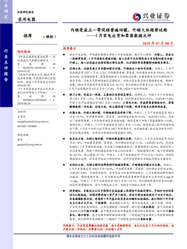 【兴业证券】【20190708】内销受益五一等促销普遍回暖,外销大体趋势延续 ——5月家电出货和零售数据点评-15页 行业研究