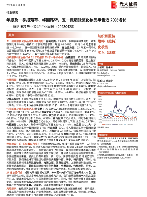 【光大证券】【20230504】20230504-光大证券-纺织服装与化妆品行业周报:年报及一季报落幕、峰回路转,五一假期服装化妆品零售近20%增长-20页 行业研究