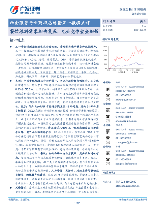 【广发证券】【20210506】社会服务行业财报总结暨五一数据点评:餐饮旅游需求加快复苏,龙头竞争壁垒加强-57页 行业研究