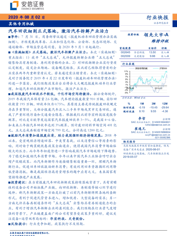 【安信证券】【20200802】20200802-安信证券-其他专用机械行业快报:汽车回收细则正式落地,激活汽车拆解产业活力-3页 行业研究