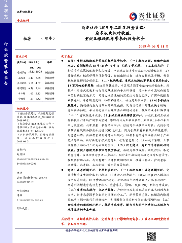 【兴业证券】【20190611】酒类板块2019年二季度投资策略:看多板块相对收益,重视五粮液改革带来的投资机会-28页 行业研究