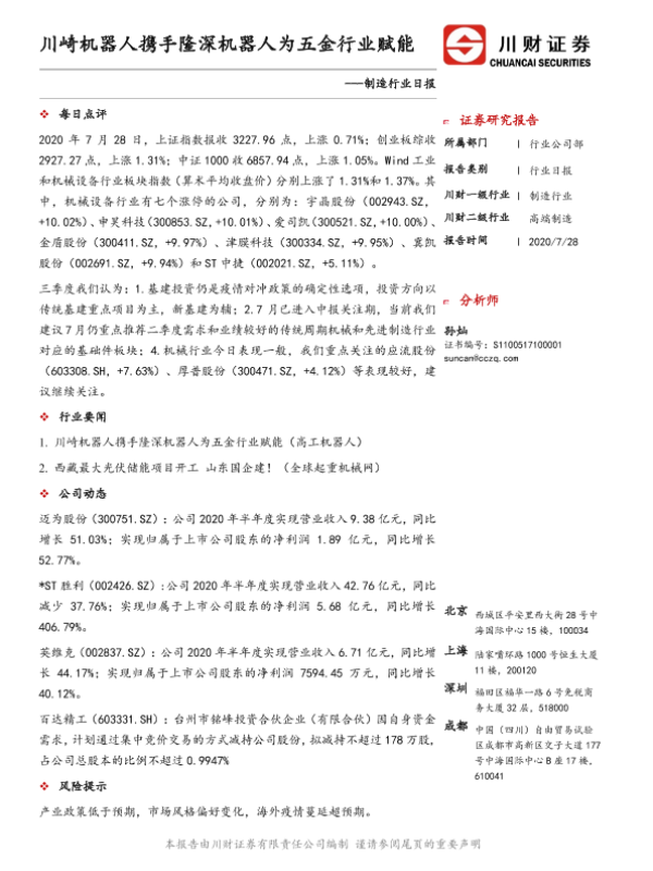 【川财证券】【20200728】制造行业日报:川崎机器人携手隆深机器人为五金行业赋能-2页 证券期货研究报告
