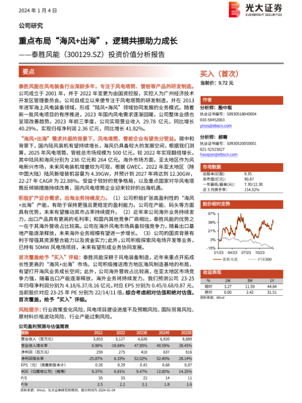 【光大证券】【20240104】泰胜风能(300129.SZ)投资价值分析报告:重点布局“海风+出海”,逻辑共振助力成长-38页 行业研究