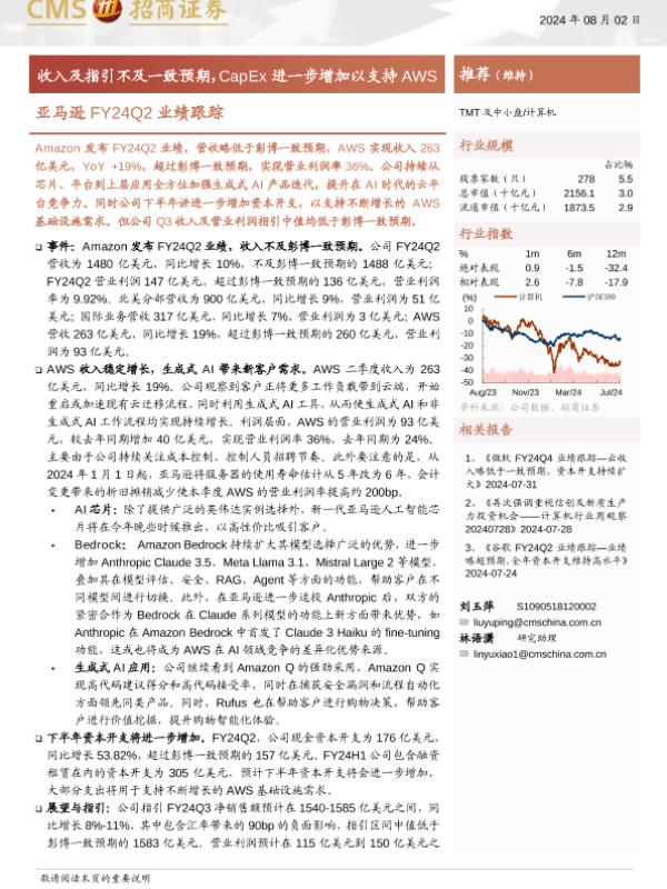 【海通证券】【20240802】计算机行业亚马逊FY24Q2业绩跟踪:收入及指引不及一致预期,CapEx进一步增加以支持AWS-16页 行业研究