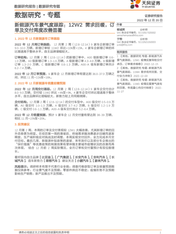 【天风证券】【20221220】新能源汽车景气度跟踪:12W2需求回暖,订单及交付周度改善显著-13页 行业研究