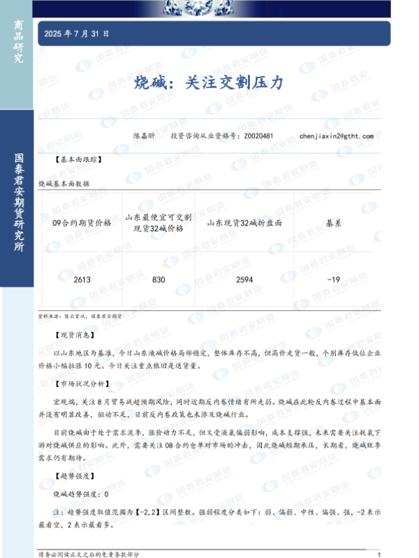 【国泰君安期货】【20250731】烧碱:关注交割压力-2页 证券期货研究报告